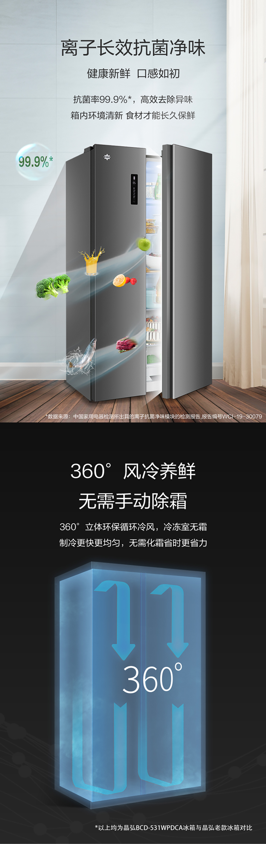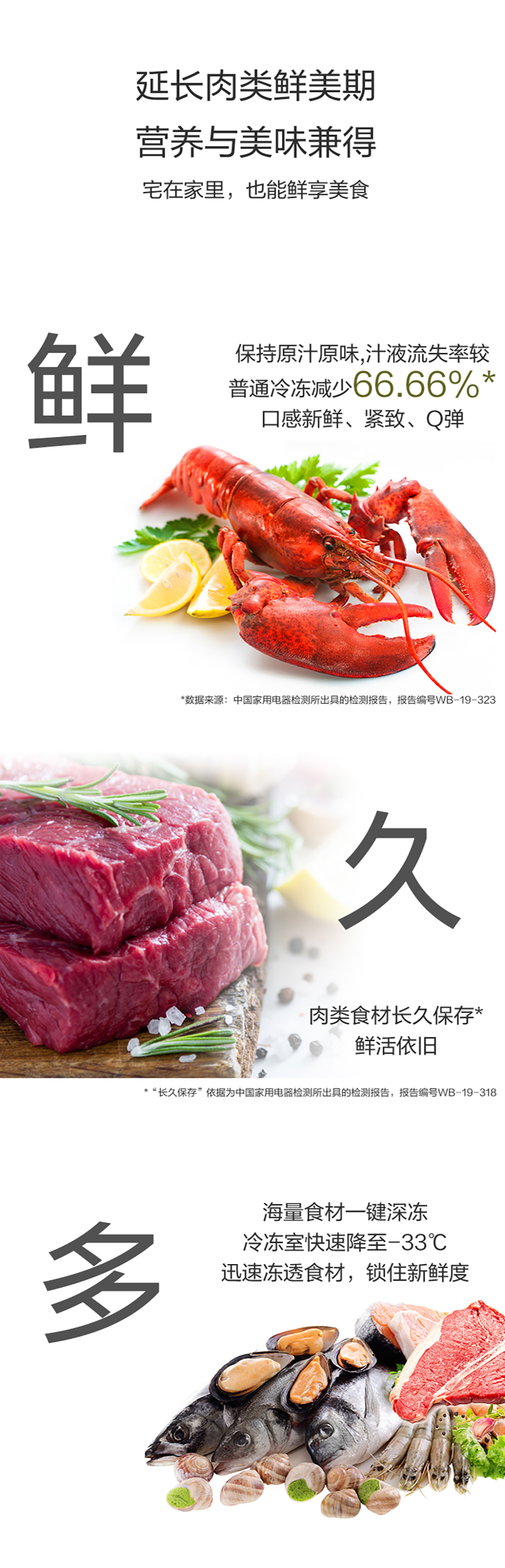 搭載-33℃深凍鎖鮮科技,肉汁飽滿更長(zhǎng)久。采用離子長(zhǎng)效抗菌凈味,抗菌率高達(dá)99.9%。風(fēng)冷無霜,拒絕風(fēng)干,食材水潤(rùn)新鮮。